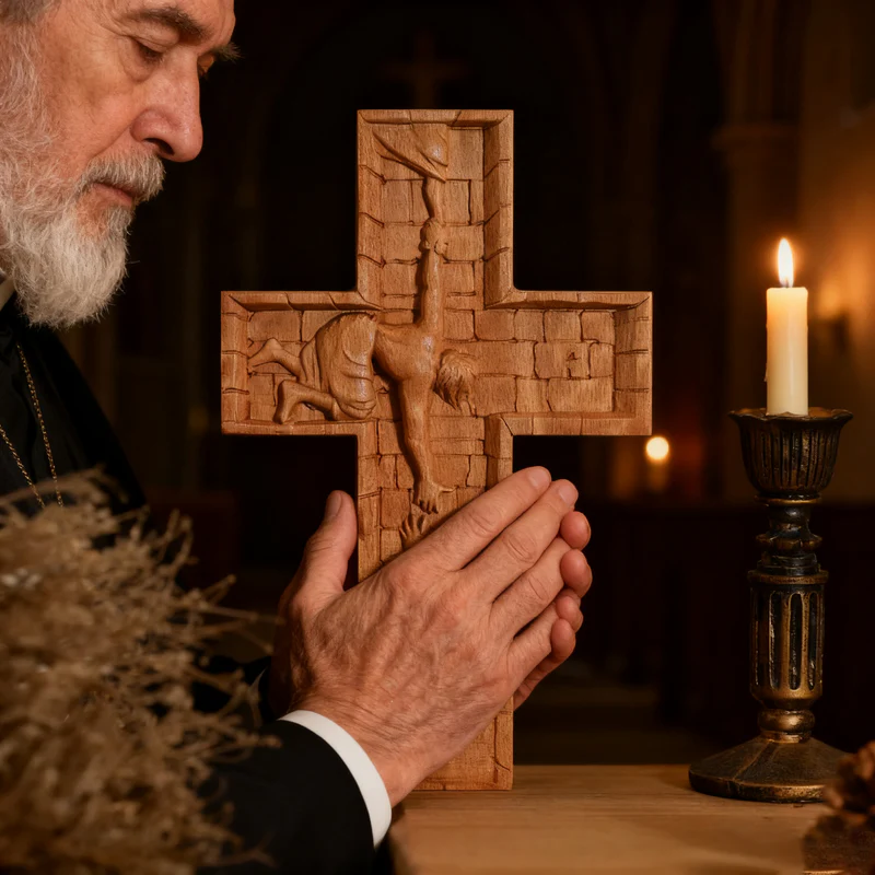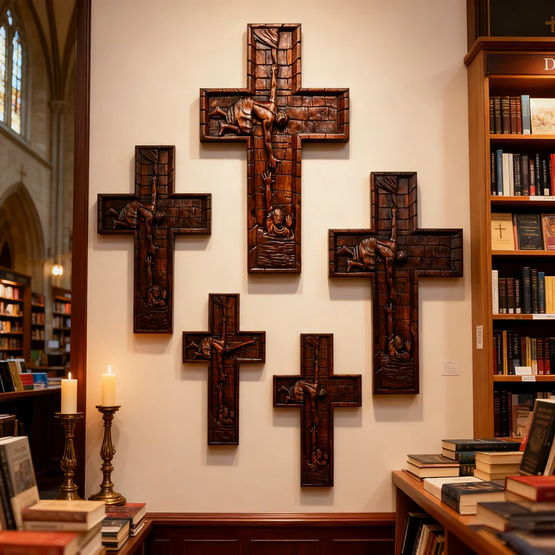 The cross features a powerful depiction of a savior reaching down to rescue a person trapped in despair, embodying themes of redemption and hope at the heart of Christian faith. - Detailed Imagery: