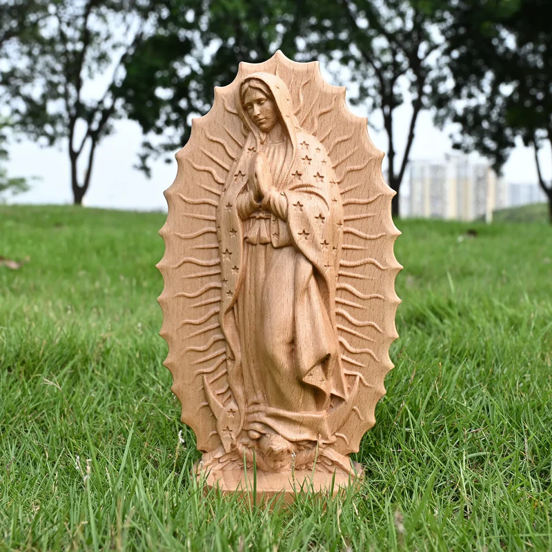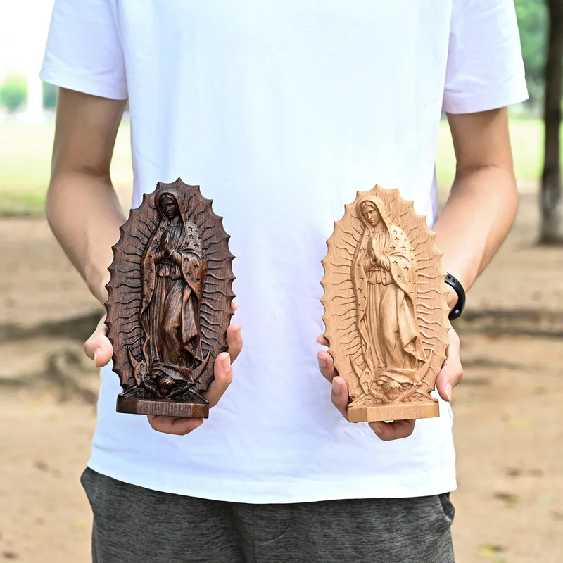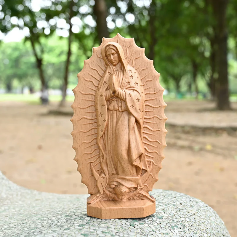 This Guadalupe beech – wood desktop ornament is carefully crafted from solid beech wood with the heart of a craftsman. With the natural and smooth texture of the dark – brown wood, every notch is filled with respect. From the Virgin’s clasped hands, the starlight on the robe, to the divine light surrounding the body, all of which are vivid. The simple texture of beech wood blends with the delicate carving, freezing the solemnity and kindness of the Virgin of Guadalupe in a small space, becoming a concrete embodiment of faith. Every detail tells the admiration and yearning for the divine.