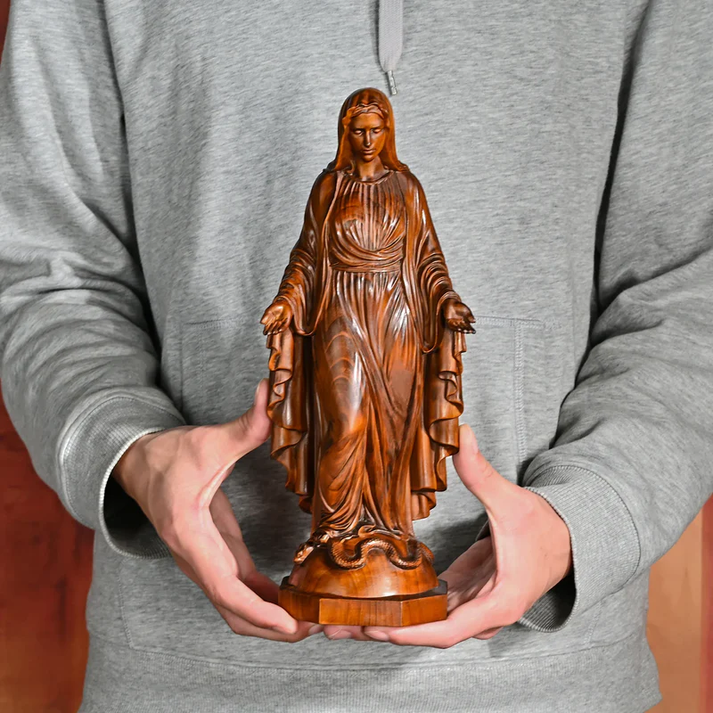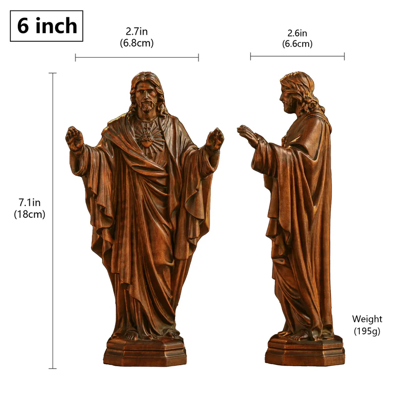 The face of Jesus in this statue is serene and kind, and his deep eyes seem to contain endless wisdom and love, able to penetrate the clamor of the world and reach the depths of the soul. The slightly upturned corners of his mouth seem to convey tolerance and comfort, so that everyone who gazes at him can feel inner peace and tranquility. Jesus was wearing a robe, such as clouds and water like natural drooping, each fold was carefully carved by craftsmen, delicate and realistic, the texture of the robe fluttering in the wind, as if people can really feel the divine breath flowing in the air, showing the solemnity and holiness of Jesus, as if he was slowly coming from the clouds, with God’s will and blessings. His arms are open, as if embracing the whole world, giving the world endless love and tolerance, this gesture is not only the interpretation of faith, but also a kind of spiritual inspiration, inspiring people to open their hearts, accept love and hope, and go forward on the road of life.