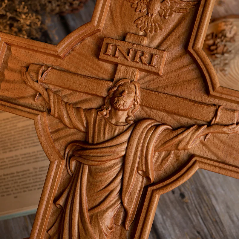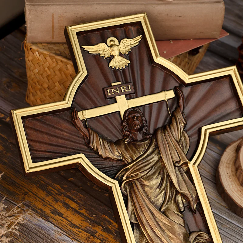This Ascension of Jesus’ wood carving cross describes that Jesus entered heaven under the guidance of angels. The dove symbolizes that the Holy Spirit will empower the followers of Jesus with spiritual gifts and power that enables the proclamation of Jesus Christ, and the power that brings conviction of faith.