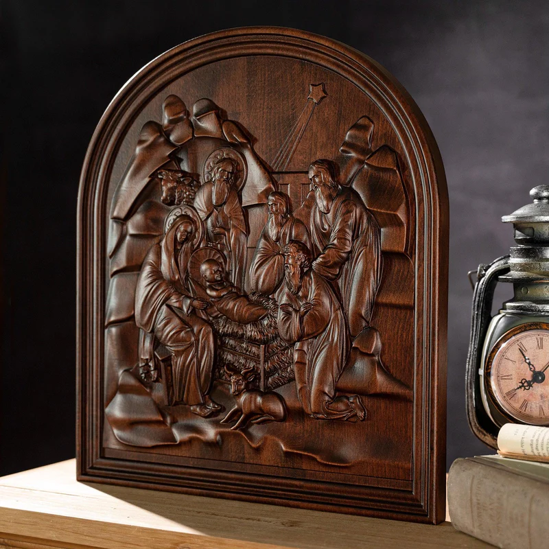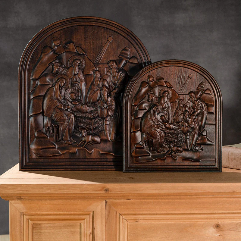 Natural beech nativity scene wood carving plaque
