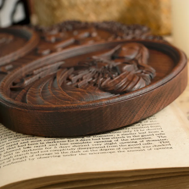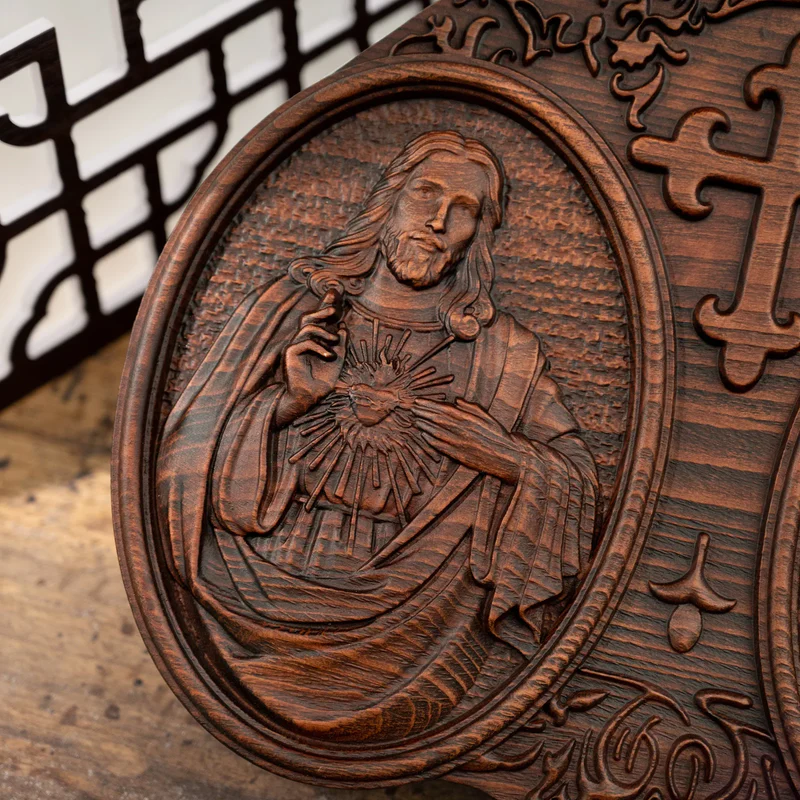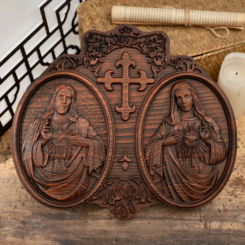 This wood carving artwork depicts the Sacred Heart of Jesus, the Immaculate Heart of Mary and the Chaste Heart of Saint Joseph. The Sacred Heart of Jesus is a symbol of Christ’s infinite love for mankind, it has wounds on its flanks, and the crown of thorns represents the wounds of our sins. A cross is implanted in it to represent the grief he has caused in his life and passions. This image was given by Jesus to the French nun Saint Margaret Marie Alacoque in a series of revelations in the 17th century.