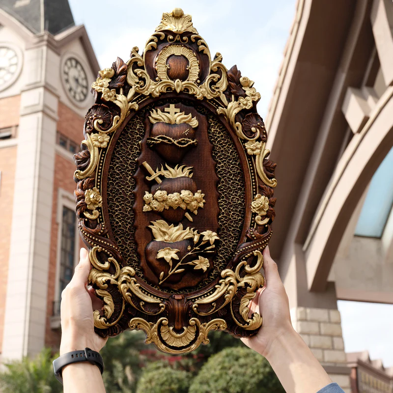 This exquisite wood-carved artwork is a great gift for a loved one (or yourself) who is especially devoted to the Holy Family, especially their so-called three Sacred Hearts – the Sacred Heart of Jesus, the Heart of the Immaculate Conception and Chastity in the heart of Joseph.